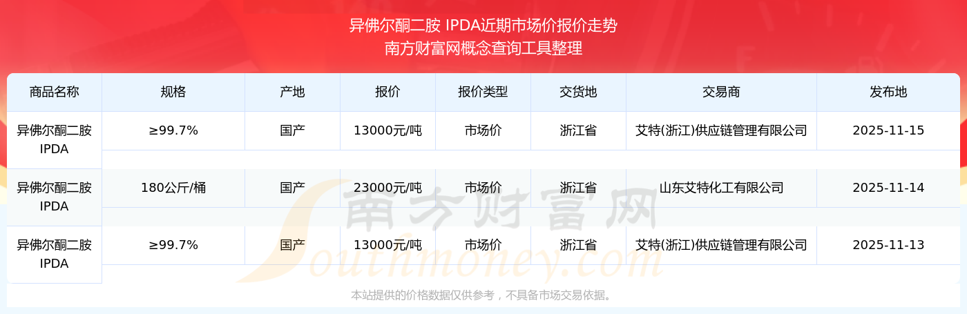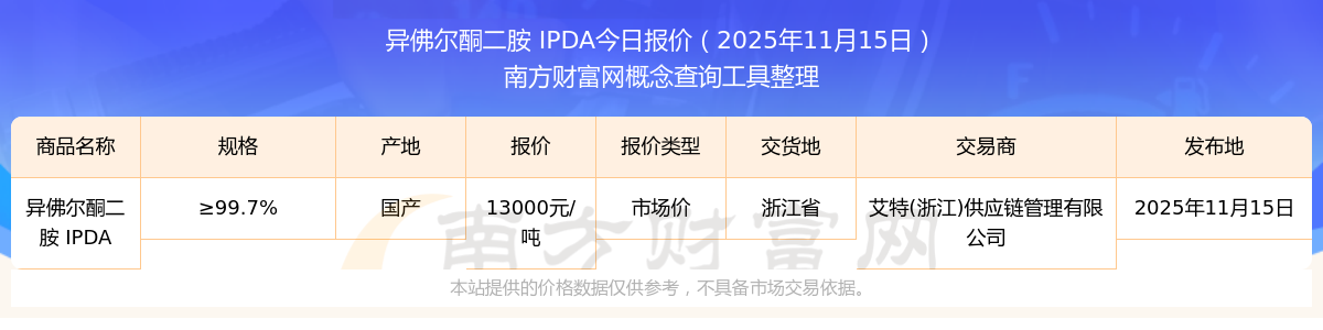 2025年11月15日,異佛爾酮二胺 IPDA(≥99.7%)市場價(jià)價(jià)格為13000.00元/噸,報(bào)價(jià)人:艾特(浙江)供應(yīng)鏈管理有限公司,交易地點(diǎn)為浙江省。
