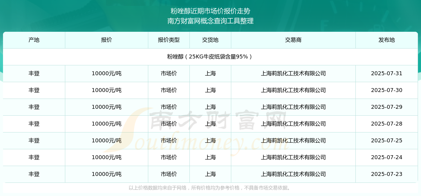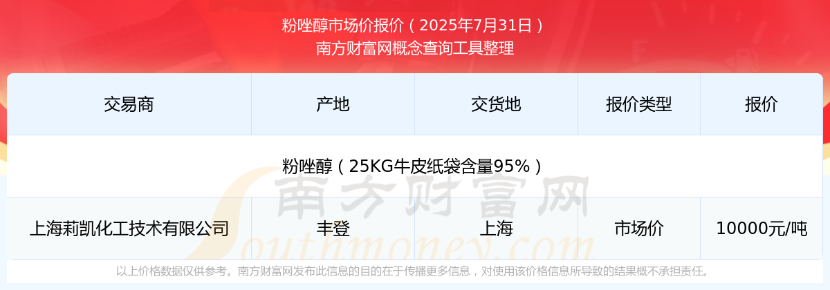2025年7月31日,上海莉凱化工技術(shù)有限公司粉唑醇(25KG牛皮紙袋含量95%),豐登,交易地點為上海,市場價報價為10000.00元/噸。