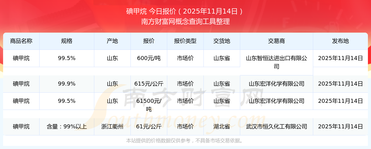 2025年11月14日,山東智恒達(dá)進(jìn)出口有限公司碘甲烷 (99.5%),山東,交易地點為山東省,市場價報價為600.00元/噸。