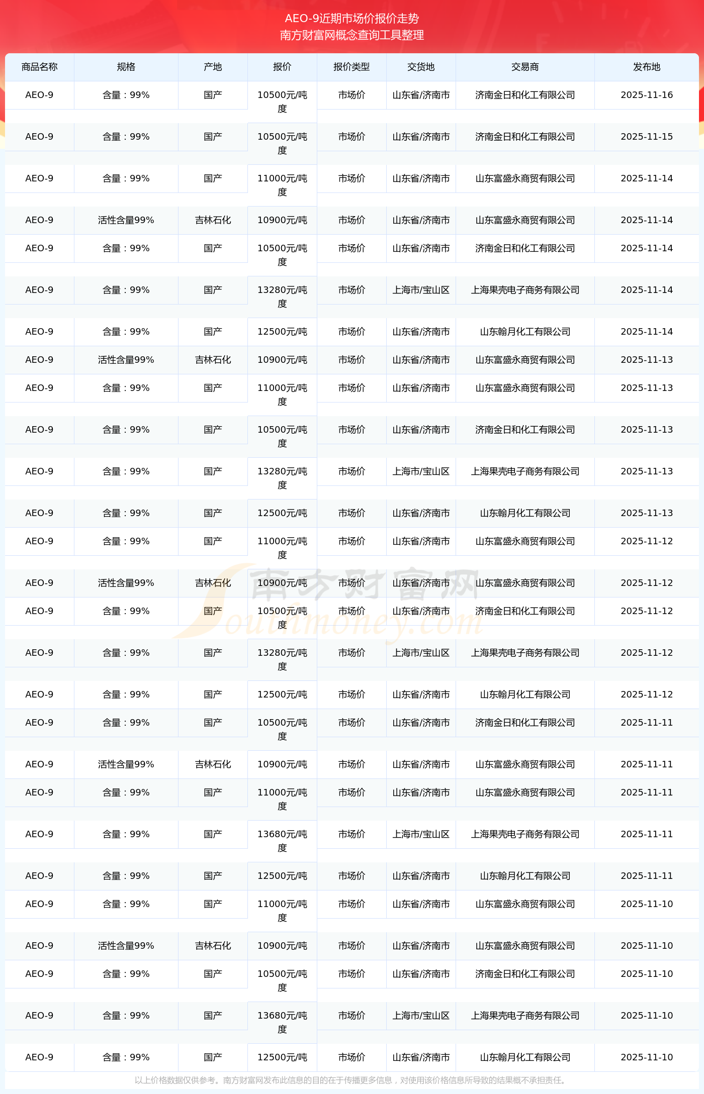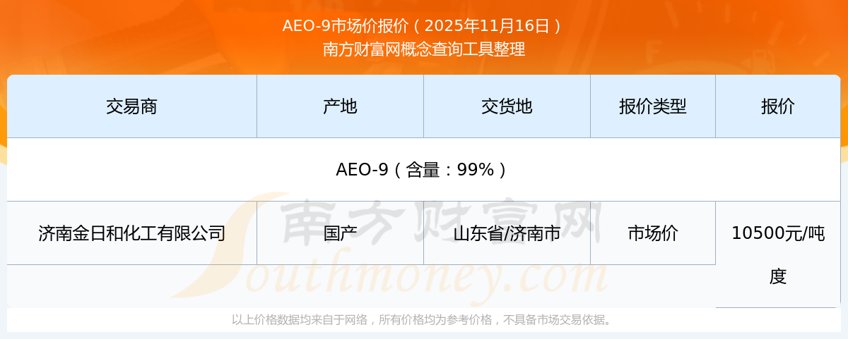 2025年11月16日,濟南金日和化工有限公司AEO-9(含量:99%),國產(chǎn),交易地點為山東省/濟南市,市場價報價為10500.00元/噸度。