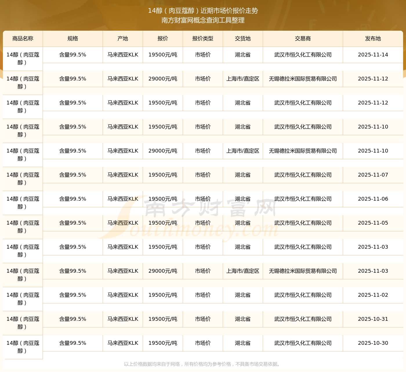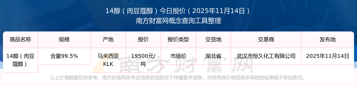 2025年11月14日,14醇(肉豆蔻醇)(含量99.5%)市場價價格為19500.00元/噸,報價人:武漢市恒久化工有限公司,交易地點(diǎn)為湖北省。