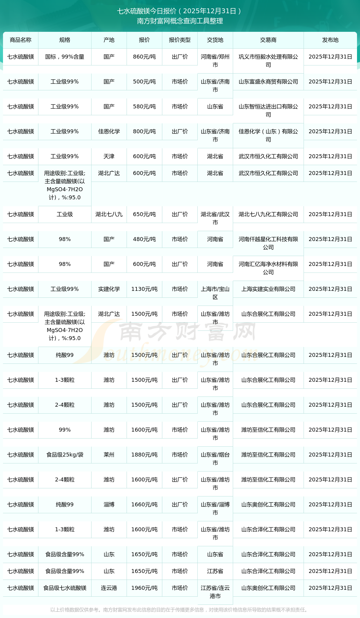 2025年12月31日,七水硫酸鎂(國標,99%含量)價格為860.00元/噸,報價人:鞏義市恒毅水處理有限公司,交易地點為河南省/鄭州市。