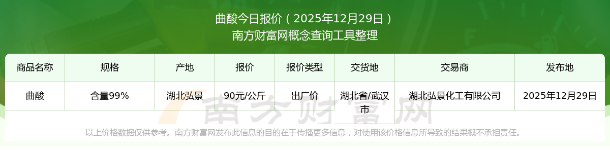 2025年12月29日,湖北弘景化工有限公司曲酸(含量99%),湖北弘景,交易地點(diǎn)為湖北省/武漢市,出廠價(jià)報(bào)價(jià)為90.00元/公斤。