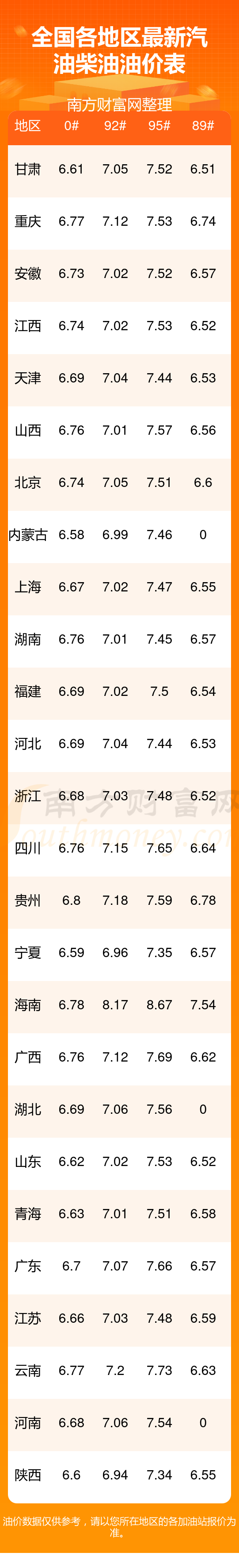 汽油、柴油10月24日每升的價格為10月14日調(diào)整后的價格,具體油價為:92號汽油7.01元;95號汽油7.57元;89號汽油6.56元;0號柴油6.76元。