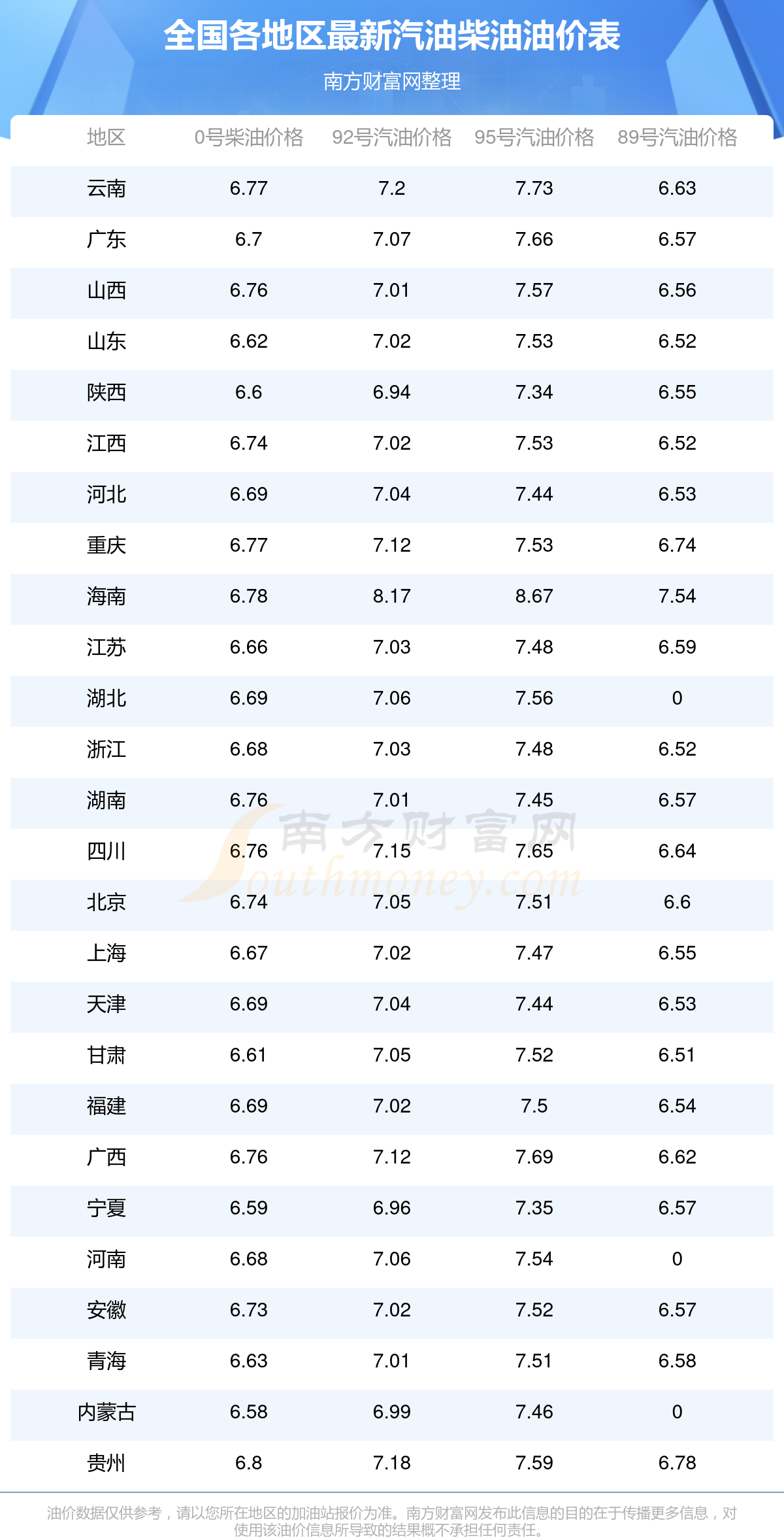 95號汽油平均價格:8元每升,其中,最高為海南,價格8.67元/升,最低為陜西,價格7.34元/升。