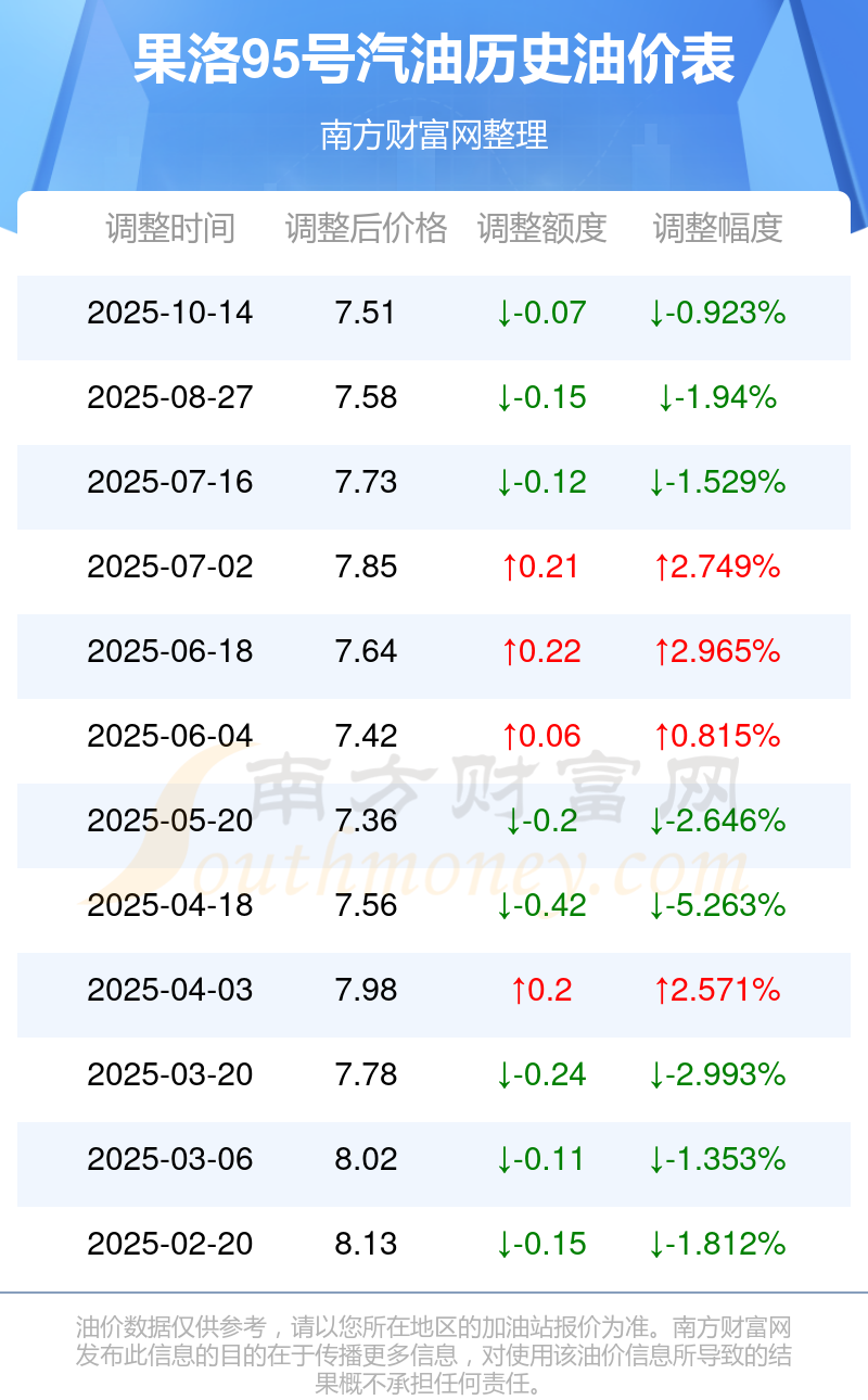 95號汽油價(jià)格查詢(2025-10-24)2025年果洛最新油價(jià)查詢表一覽