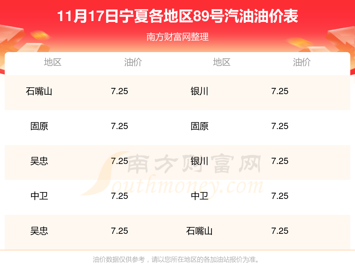 2025年11月17日寧夏89號(hào)汽油最新價(jià)格一覽表