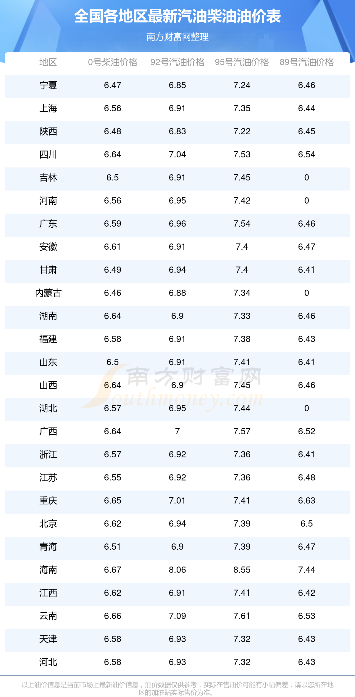 全國(guó)89號(hào)汽油平均價(jià)格為:7元每升,其中,最低為浙江,價(jià)格6.41元/升,最高為海南,價(jià)格7.44元/升。