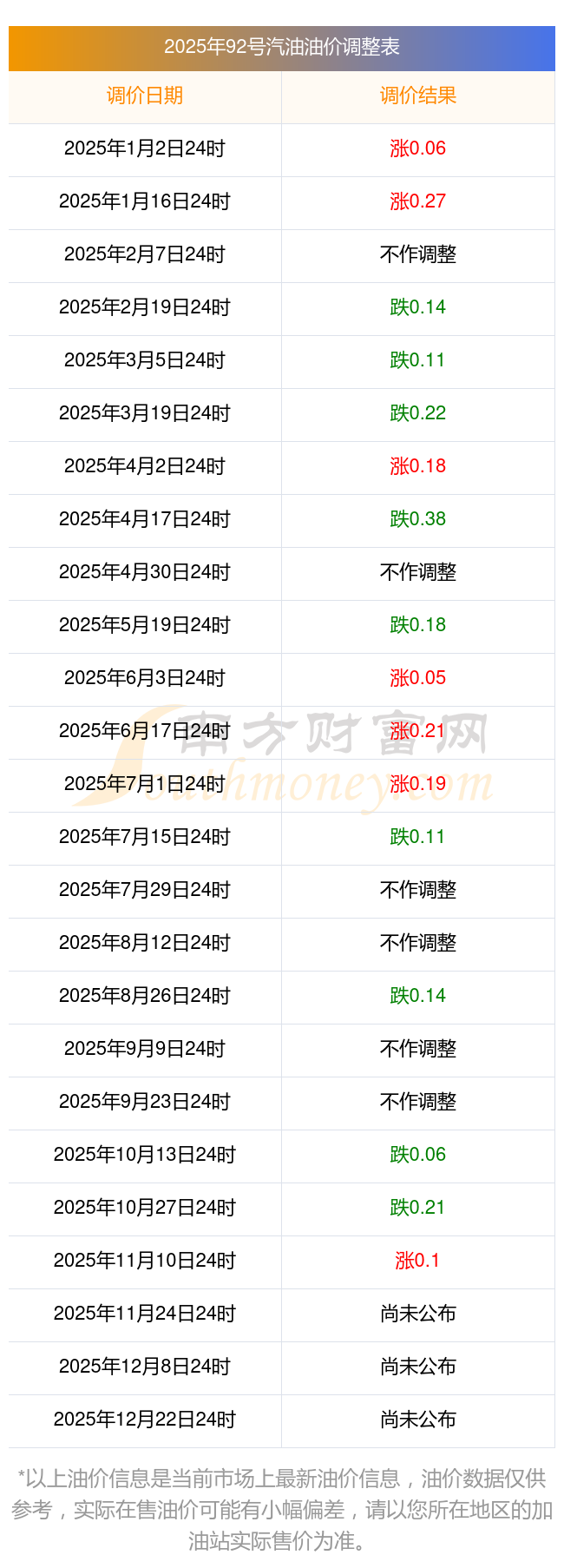 2025年11月17日全國油價(jià)調(diào)整一覽表