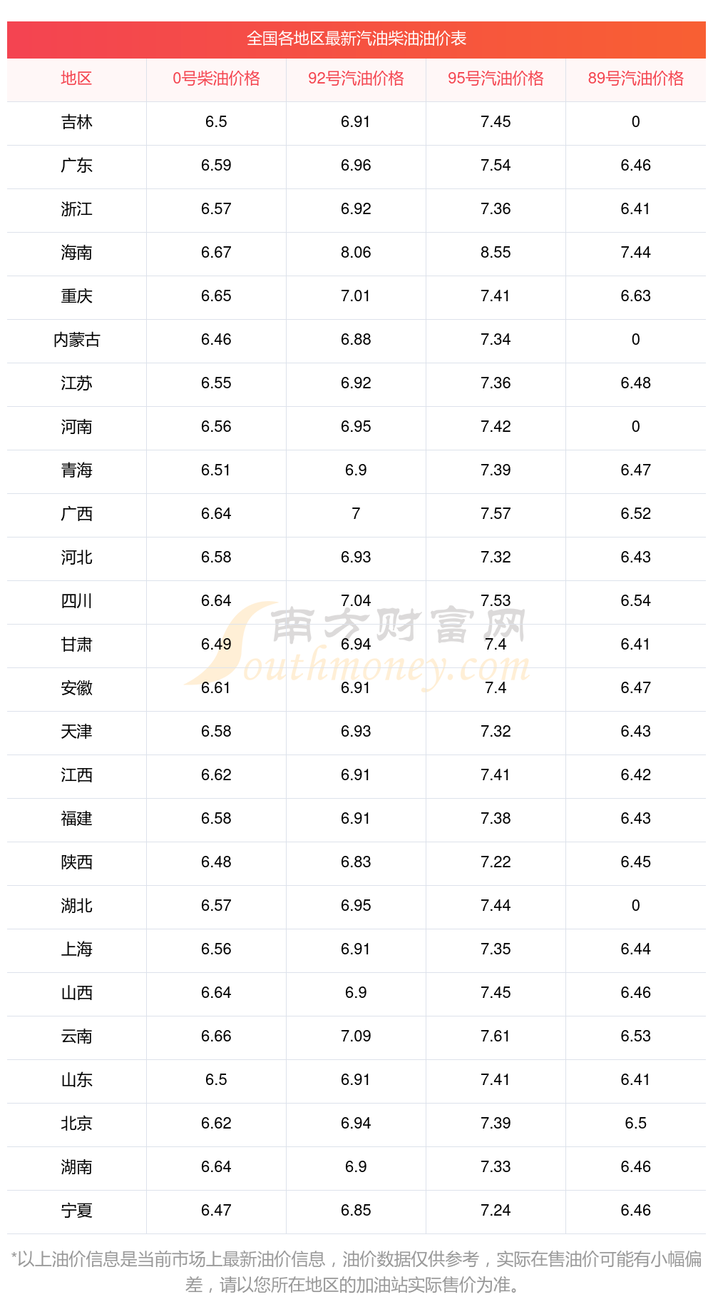 11月17日,全國89號汽油最新平均價格為:7元每升,調(diào)整時間為11月11日,其中,全國89號汽油最低為浙江,價格為6.41元/升,89號汽油最高為海南,價格為7.44元/升。下一輪油價調(diào)整時間11月24日24時,距離現(xiàn)在還有7.8天。