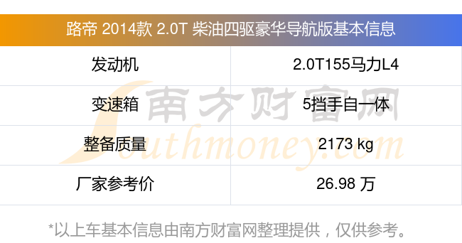 路帝 2014款 2.0T 柴油四驅(qū)豪華導(dǎo)航版動(dòng)力方面,搭載的是一臺(tái)2.0T155馬力L4渦輪增壓發(fā)動(dòng)機(jī),匹配5擋手自一體自動(dòng)檔變速箱,燃料形式為柴油,常規(guī)整備質(zhì)量2173kg,廠家參考價(jià)26.98萬元。