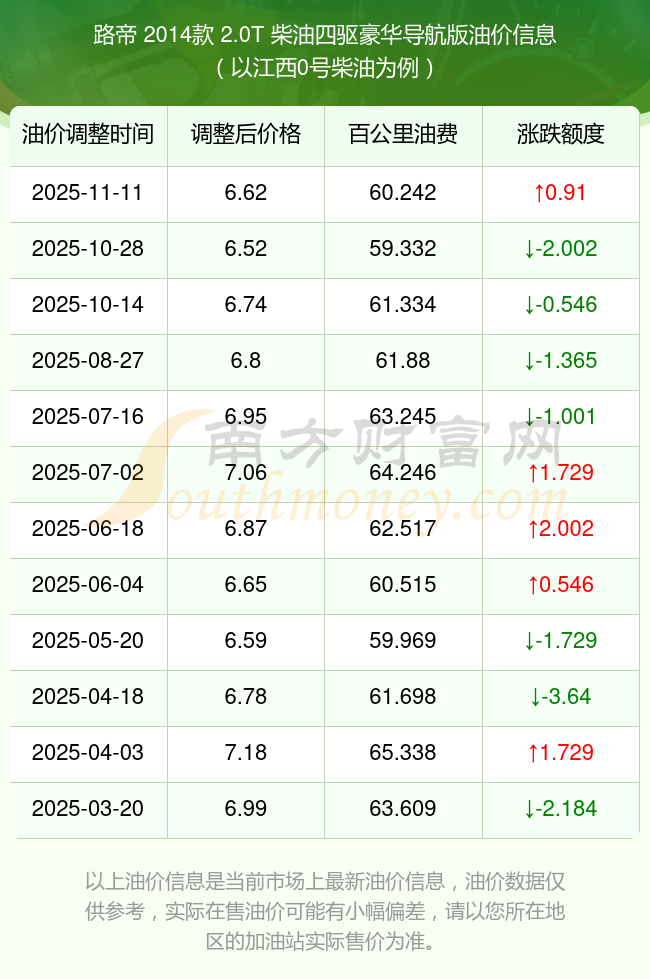 根據(jù)11月11日0號(hào)柴油最新調(diào)整價(jià)格6.62元/升來計(jì)算(以江西為例),該車型每百公里的平均油費(fèi)是60.242元,上一輪10月28日調(diào)整價(jià)格6.52元每升來計(jì)算,每百公里的平均油費(fèi)是59.332元,對(duì)比上一輪多花0.91元,下一輪的油價(jià)調(diào)整時(shí)間是11月24日24時(shí)。