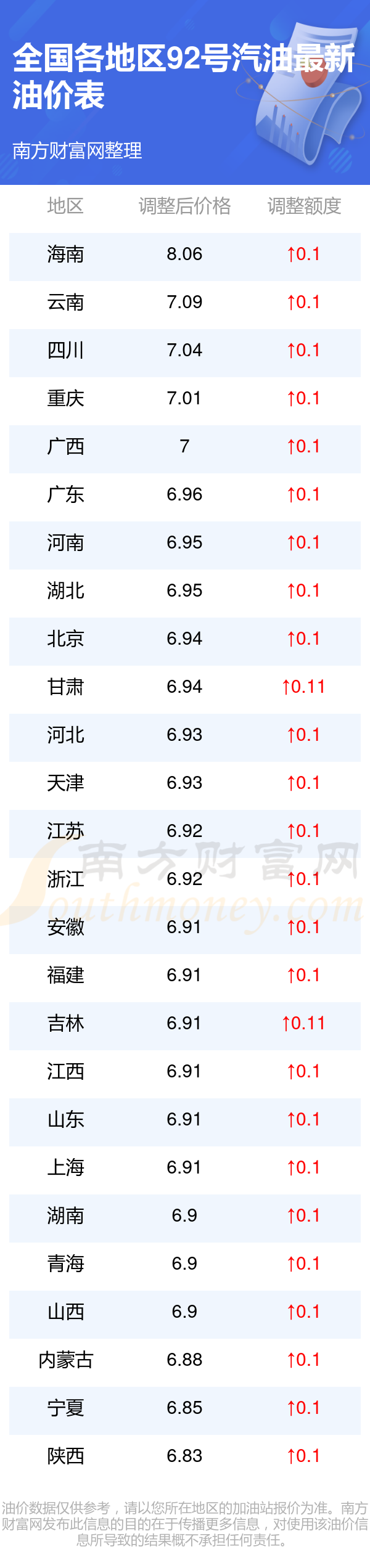 11月17日,重慶92號汽油的價格是7.01元每升,本次的調整時間為11月11日,對比上次的調整上漲了0.1元,上漲1.447%,11月24日24時為下一輪油價調整時間,還有7.76天。