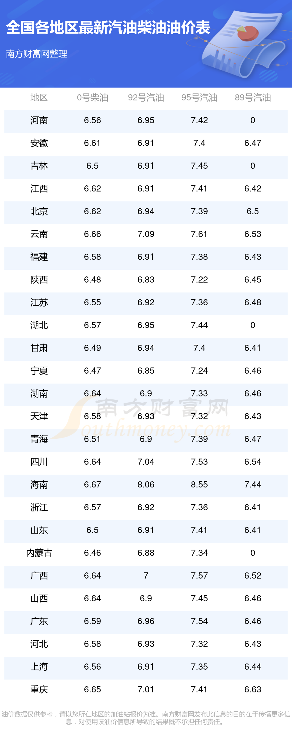全國89號汽油最新平均價格為:7元每升,其中,最高為海南,價格為7.44元/升,最低為浙江,價格為6.41元/升。
