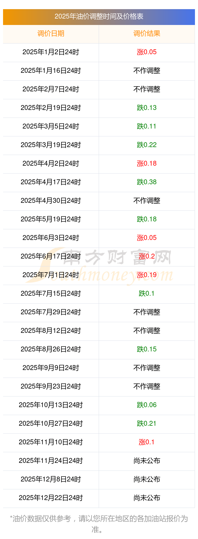 2025年11月17日全國各地油價調(diào)整時間表