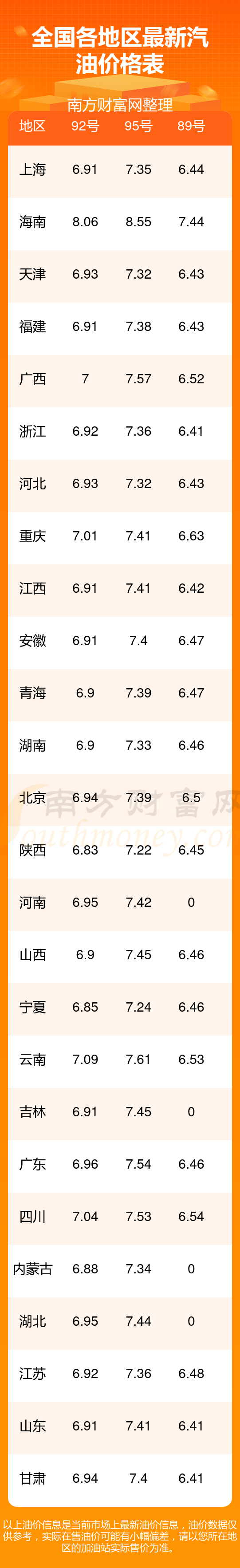 以上油價(jià)信息是當(dāng)前市場(chǎng)上最新油價(jià)信息,油價(jià)數(shù)據(jù)僅供參考,實(shí)際在售油價(jià)可能有小幅偏差,請(qǐng)以您所在地區(qū)的加油站實(shí)際售價(jià)為準(zhǔn)。