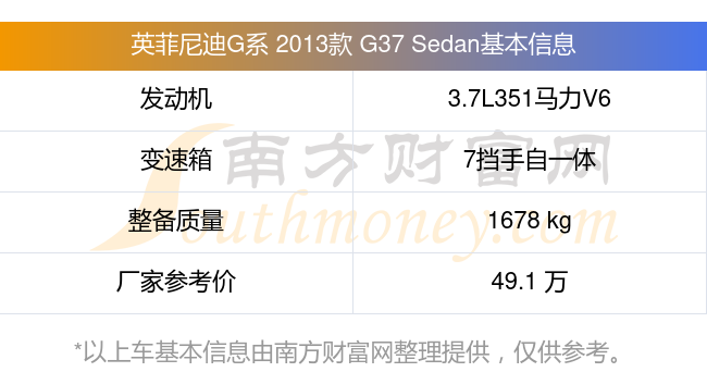 英菲尼迪G系 2013款 G37 Sedan動(dòng)力方面,搭載的是一臺(tái)3.7L351馬力V6自然吸氣發(fā)動(dòng)機(jī),匹配7擋手自一體自動(dòng)檔變速箱,燃料形式為汽油,常規(guī)整備質(zhì)量1678kg,廠家參考價(jià)49.1萬(wàn)元。