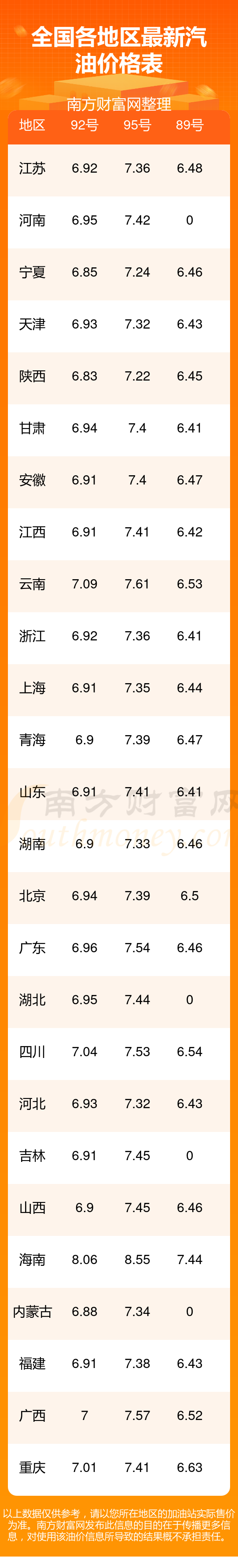 2025年11月17日全國(guó)各地汽油價(jià)格一覽表
