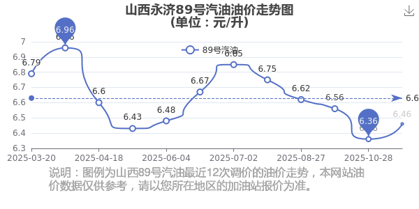 山西永濟(jì)汽油、柴油11月17日每升最新價格:92號汽油為6.9元;95號汽油為7.45元;89號汽油為6.46元;0號柴油為6.64元,本輪油價調(diào)整時間為11月11日。