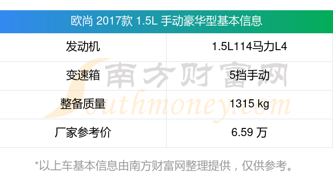 歐尚 2017款 1.5L 手動豪華型動力上配備的是一臺1.5L114馬力L4自然吸氣發(fā)動機(jī),匹配的是5擋手動擋變速箱,燃料形式為汽油,常規(guī)整備質(zhì)量1315kg,廠家參考價6.59萬元。