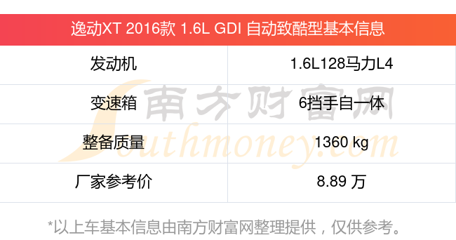 逸動(dòng)XT 2016款 1.6L GDI 自動(dòng)致酷型動(dòng)力方面,搭載的是一臺(tái)1.6L128馬力L4自然吸氣發(fā)動(dòng)機(jī),匹配6擋手自一體自動(dòng)檔變速箱,燃料形式為汽油,常規(guī)整備質(zhì)量1360kg,廠家參考價(jià)8.89萬(wàn)元。