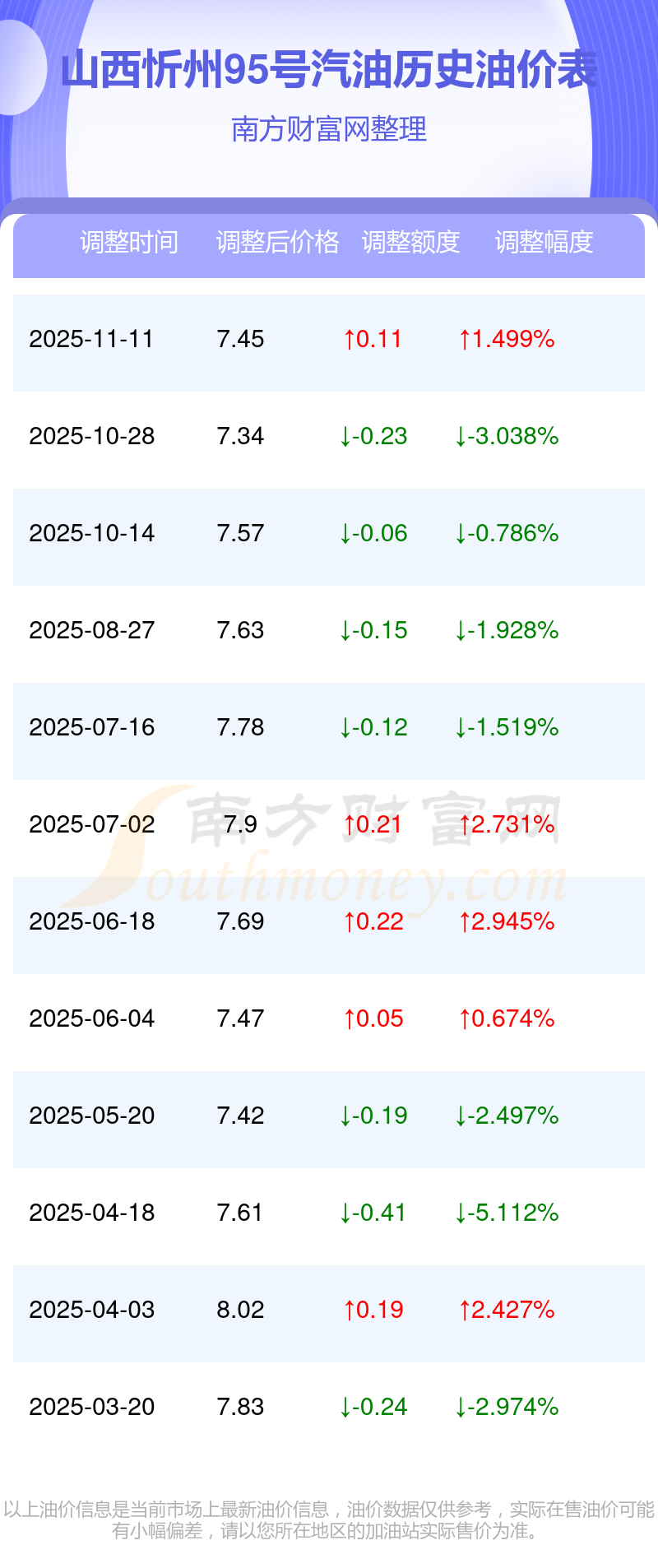 11月17日山西忻州95號汽油的價格為7.45元/升,本輪油價的調(diào)整時間為11月11日,相對上一輪油價調(diào)整時間10月28日的價格7.34元/升,上漲了0.11元,上漲幅達1.499%。下一輪油價調(diào)整時間11月24日24時,距離現(xiàn)在還有7.66天。