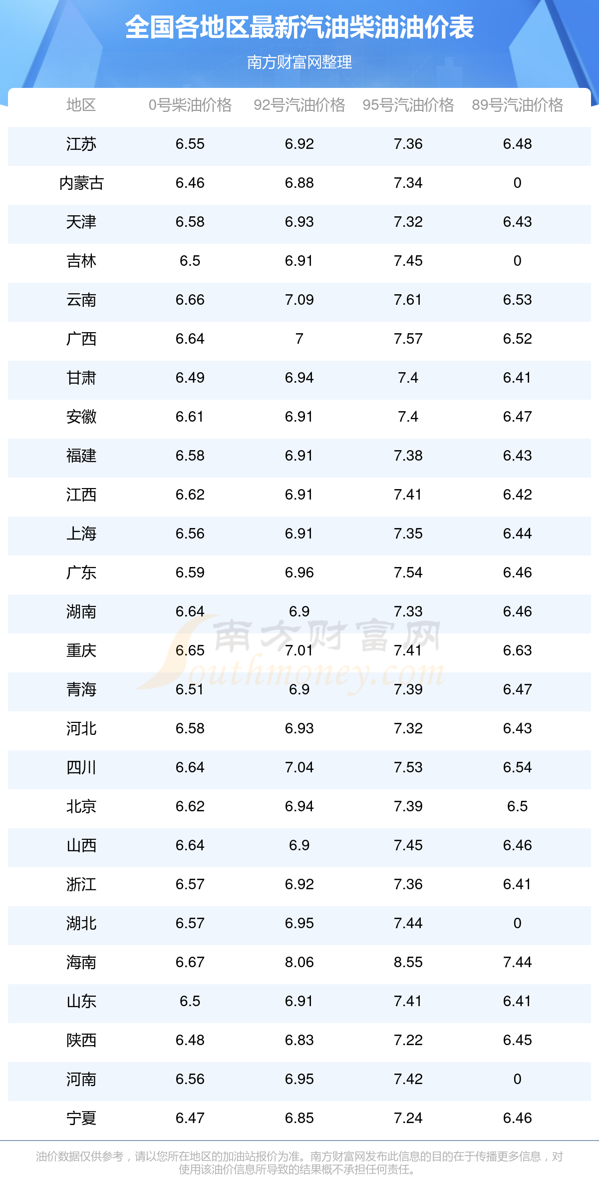 油價(jià)數(shù)據(jù)僅供參考,請(qǐng)以您所在地區(qū)的加油站報(bào)價(jià)為準(zhǔn)。南方財(cái)富網(wǎng)發(fā)布此信息的目的在于傳播更多信息,對(duì)使用該油價(jià)信息所導(dǎo)致的結(jié)果概不承擔(dān)任何責(zé)任。