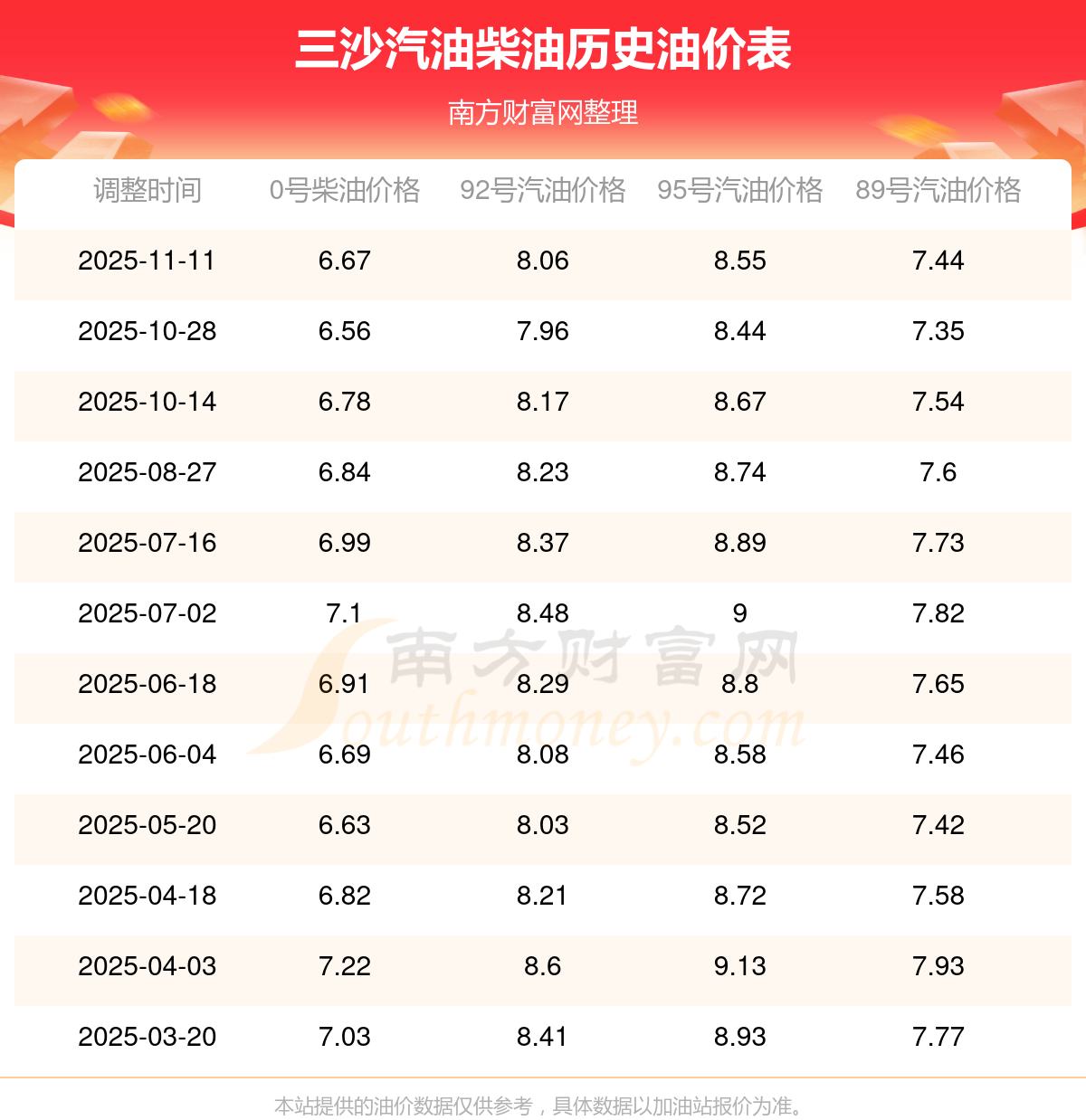 11月17日三沙汽油柴油每升的價(jià)格為11月11日調(diào)整后的價(jià)格,具體如下:92號(hào)汽油8.06元;95號(hào)汽油8.55元;89號(hào)汽油7.44元;0號(hào)柴油6.67元。