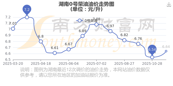 11月17日,湖南0號柴油的價格是6.64元每升,本次的調(diào)整時間為11月11日,對比上次的調(diào)整升了0.1元,升1.583%,11月24日24時為下一輪油價調(diào)整時間,還有7.65天。