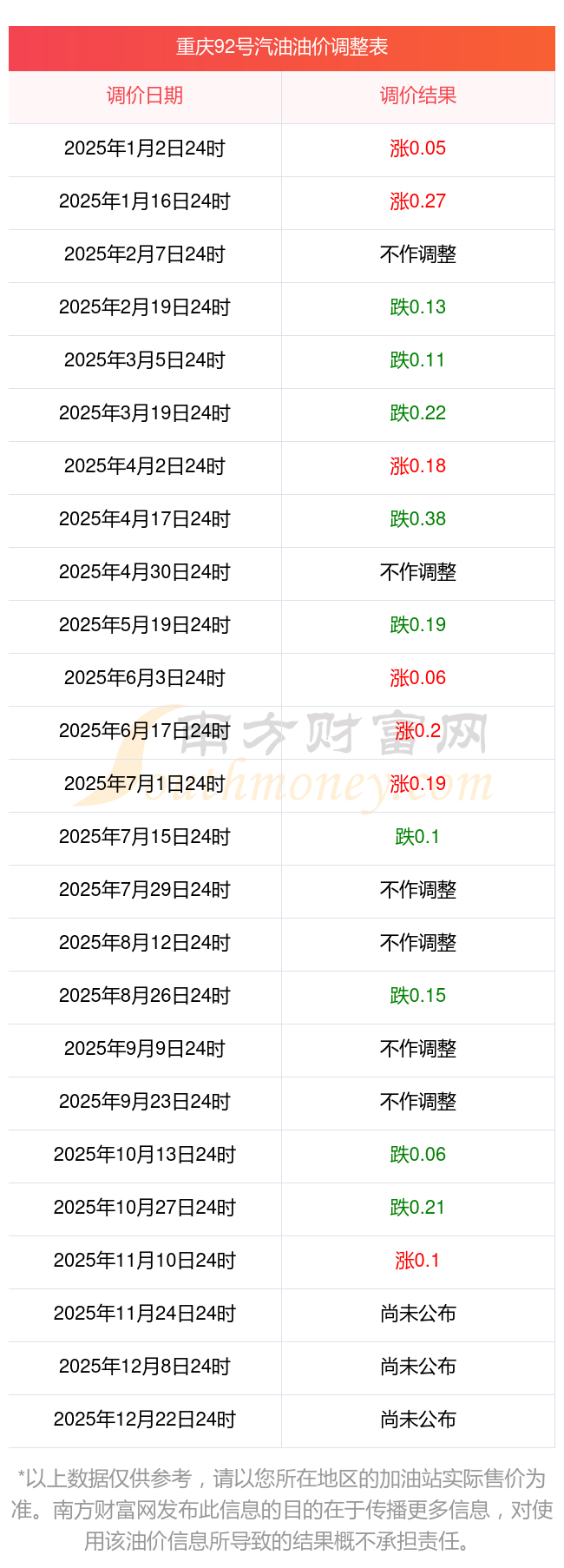11月17日,重慶92號汽油的價(jià)格是7.01元每升,本次的調(diào)整時(shí)間為11月11日,對比上次的調(diào)整升了0.1元,升1.447%,下次調(diào)整時(shí)間為11月24日24時(shí),還有7.62天。
