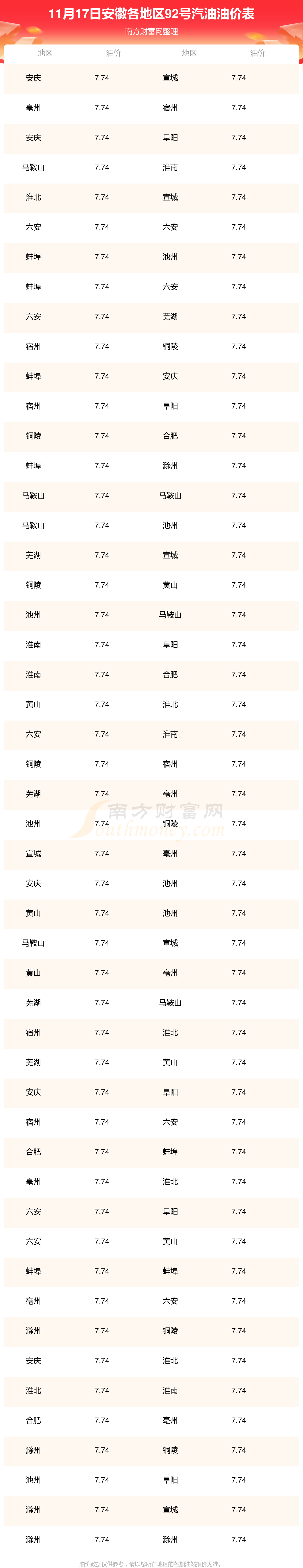 11月17日,安徽92號汽油的價格是6.91元每升,本次的調(diào)整時間為11月11日,對比上次的調(diào)整增了0.1元,增1.468%,下次調(diào)整時間為11月24日24時,還有7.62天。