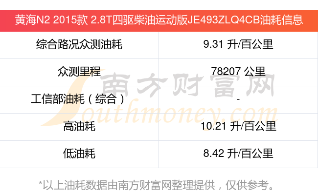 根據(jù)車主實測數(shù)據(jù),該車型低油耗為8.42L/100km,高油耗為10.21L/100km,綜合路況眾測油耗為9.31L/100km,工信部綜合油耗為-L/100km。