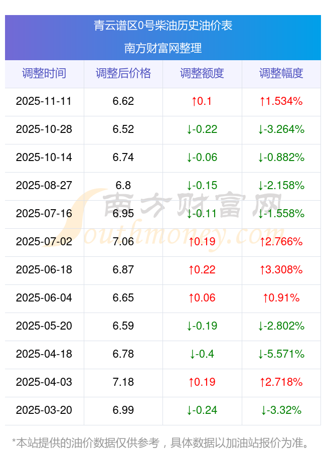 11月17日青云譜區(qū)0號柴油歷史油價一覽表