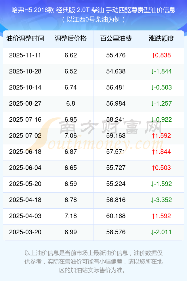 按11月11日0號柴油最新調(diào)整價格6.62元每升來計算(以江西為例),該車型百公里平均油費為55.476元,按上一輪10月28日調(diào)整價格6.52元每升來計算,百公里平均油費為54.638元,對比上一輪多花0.838元,下一輪油價調(diào)整時間為11月24日24時。