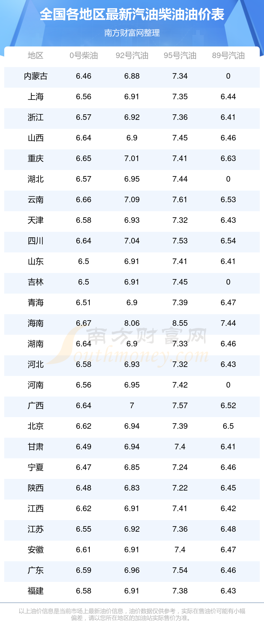 2025年11月17日全國(guó)各地汽油價(jià)格表一覽