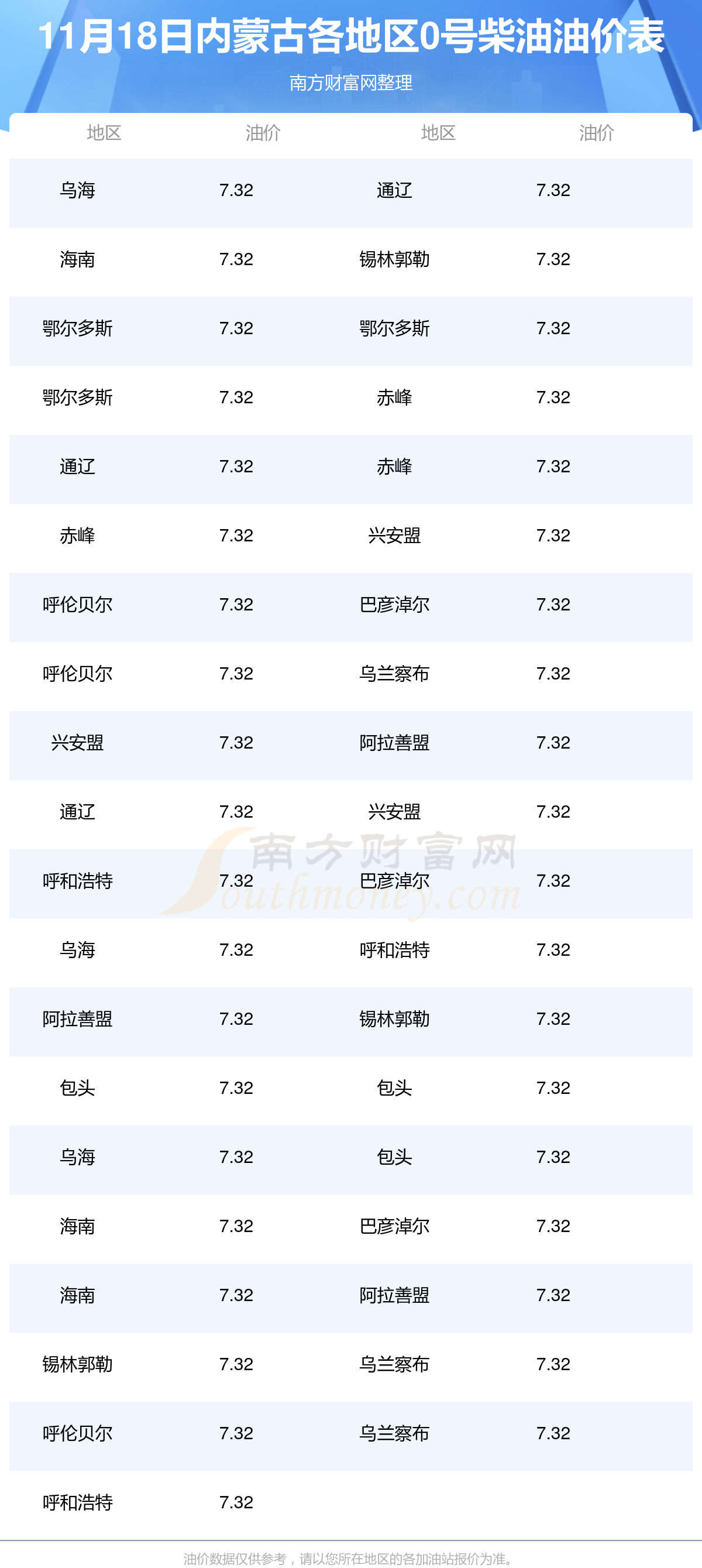 2025年11月18日內(nèi)蒙古0號柴油最新價格一覽表