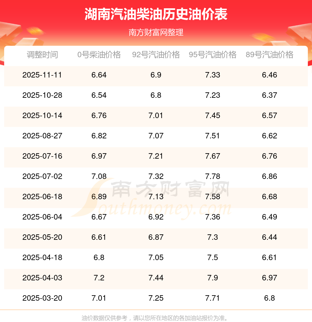 11月18日湖南汽油、柴油每升的最新價格:92號汽油6.9元;95號汽油7.33元;89號汽油6.46元,增了0.09;0號柴油6.64元,本輪油價的調(diào)整時間是11月11日。