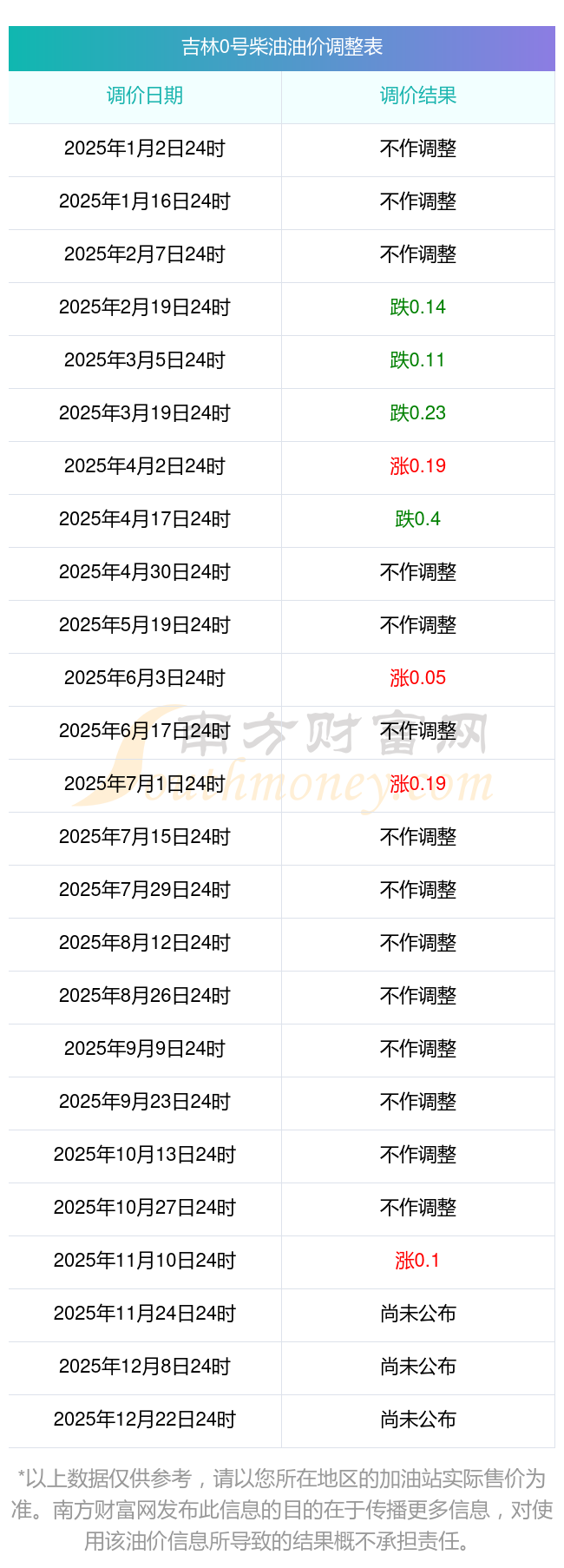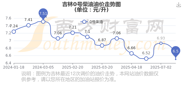 11月18日,吉林0號柴油的價格是6.5元每升,本次的調(diào)整時間為11月11日,對比上次的調(diào)整升了0.1元,升1.563%,11月24日24時為下一輪油價調(diào)整時間,還有6.85天。
