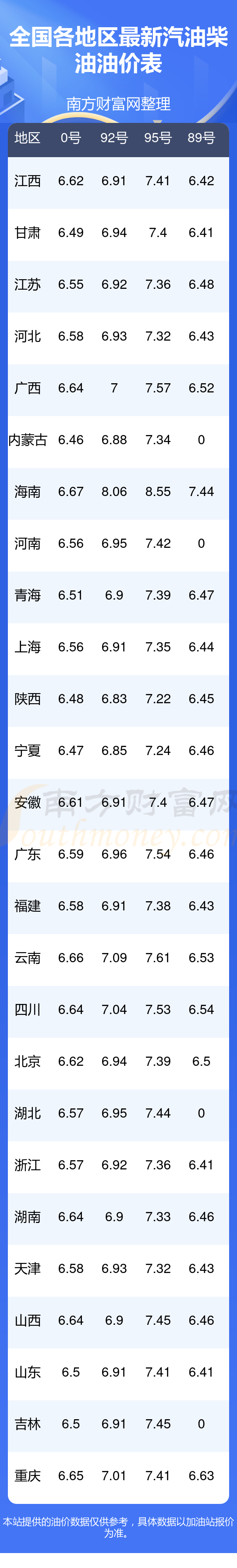 0號(hào)柴油平均價(jià)格:7元每升,其中,最高為海南,價(jià)格6.67元/升,最低為內(nèi)蒙古,價(jià)格6.46元/升。