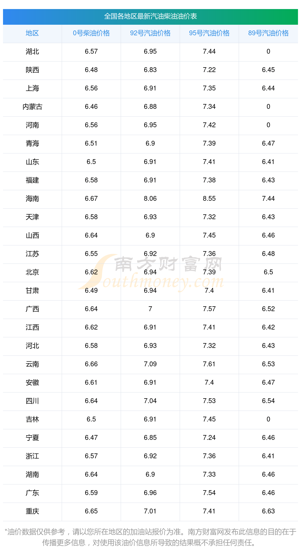 95號汽油平均價格:7元每升,其中,最高為海南,價格8.55元/升,最低為陜西,價格7.22元/升。