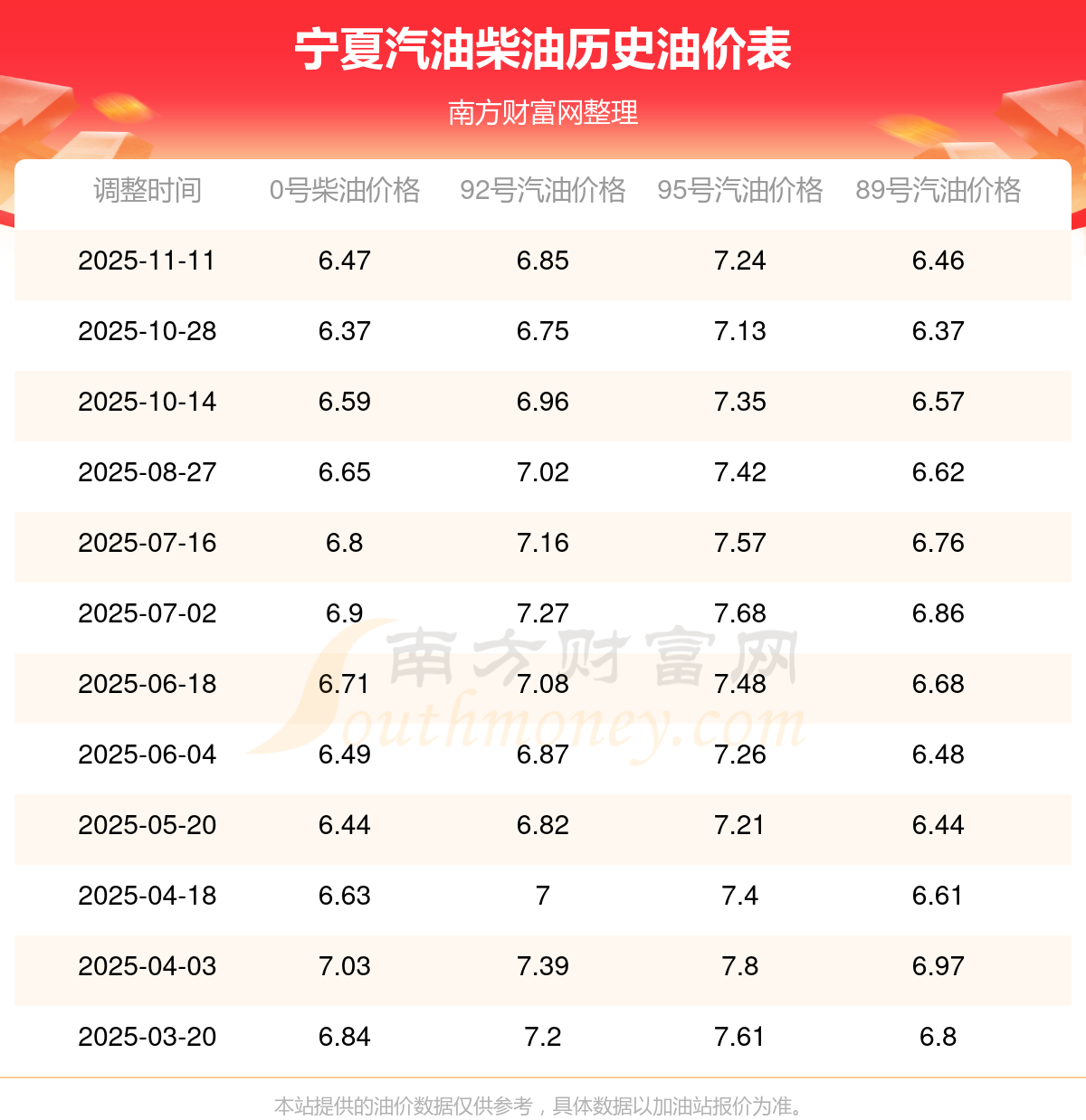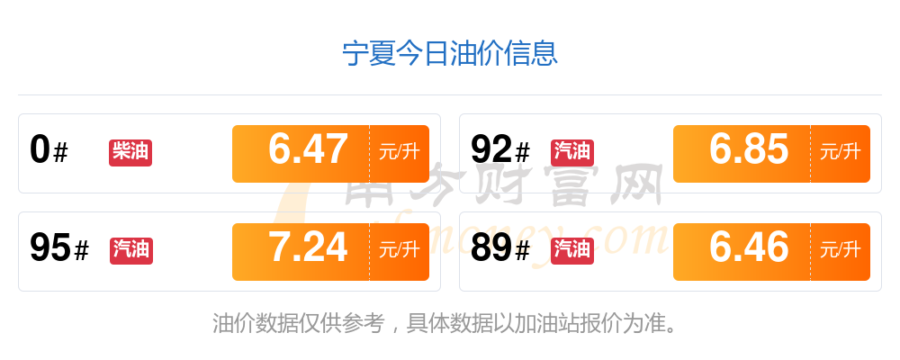 11月18日,寧夏汽油、柴油每升最新價格為:調(diào)整時間為11月11日,92號汽油為6.85元,增了0.1元,增幅達1.48%;95號汽油為7.24元,增了0.11元,增幅達1.54%;89號汽油為6.46元,增了0.09元,增幅達1.41%;0號柴油為6.47元,增了0.1元,增幅達1.57%。