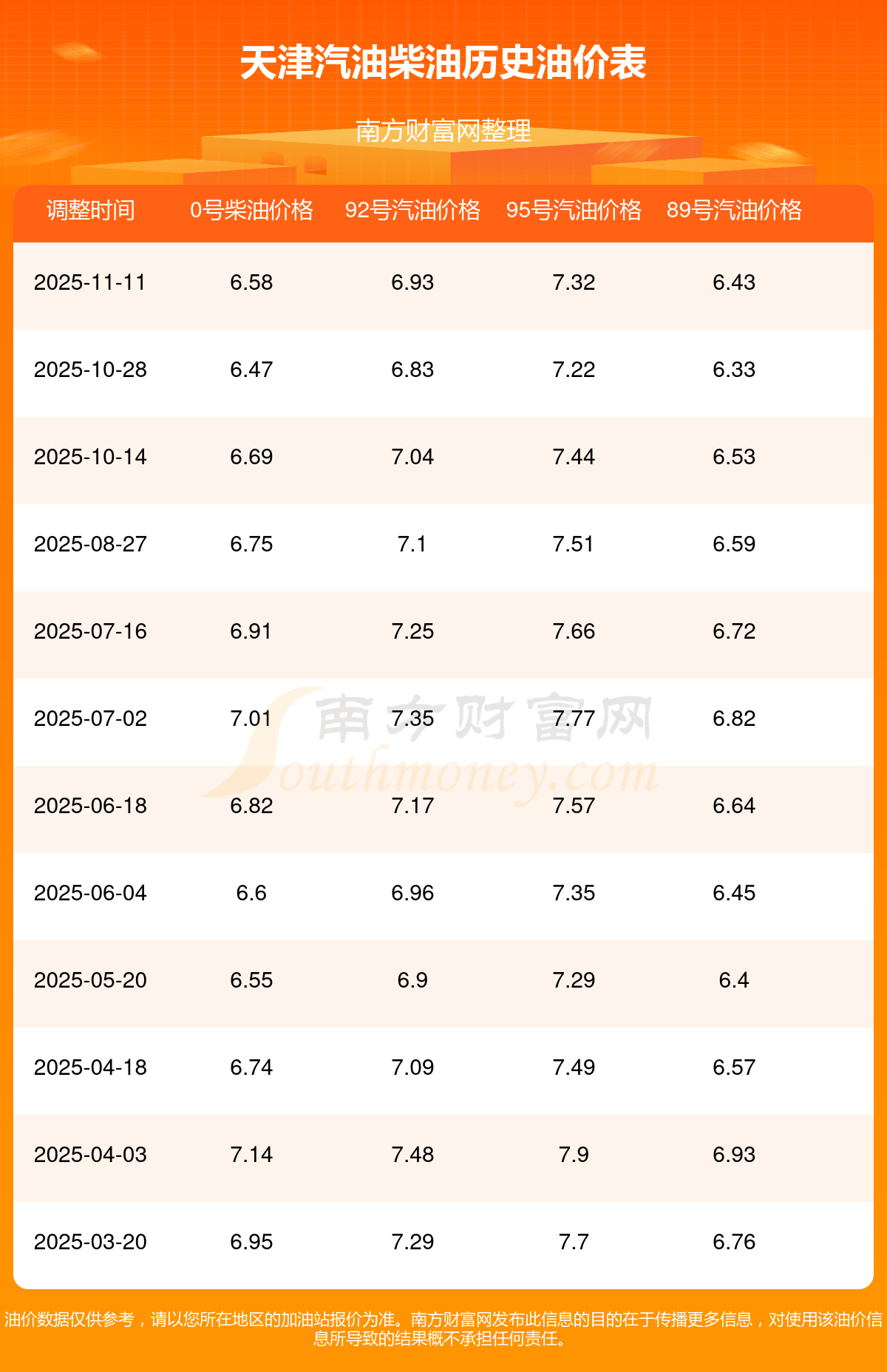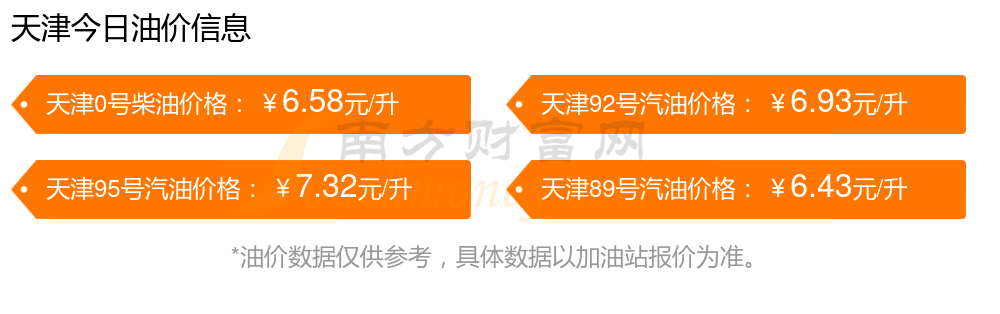 11月18日,天津汽油、柴油價(jià)格的調(diào)整時(shí)間為11月11日。每升最新價(jià)格為:92號(hào)汽油為6.93元,上調(diào)了0.1元;95號(hào)汽油為7.32元,上調(diào)了0.1元;89號(hào)汽油為6.43元,上調(diào)了0.1;0號(hào)柴油為6.58元,上調(diào)了0.11元。
