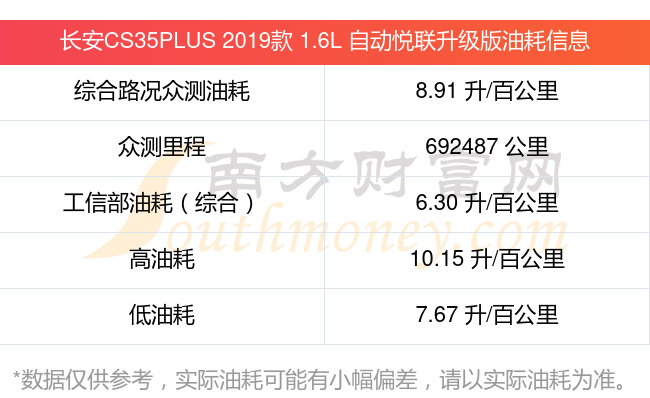 根據(jù)車主實(shí)測(cè)數(shù)據(jù),該車型低油耗為7.67L/100km,高油耗為10.15L/100km,綜合路況眾測(cè)油耗為8.91L/100km,工信部綜合油耗為6.30L/100km。