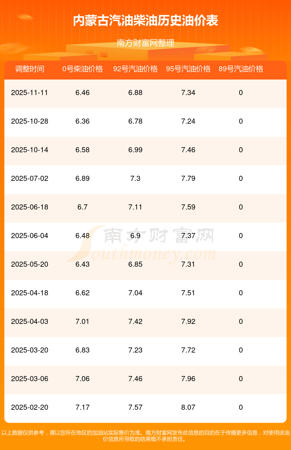 2025年內(nèi)蒙古汽油價(jià)格一覽表