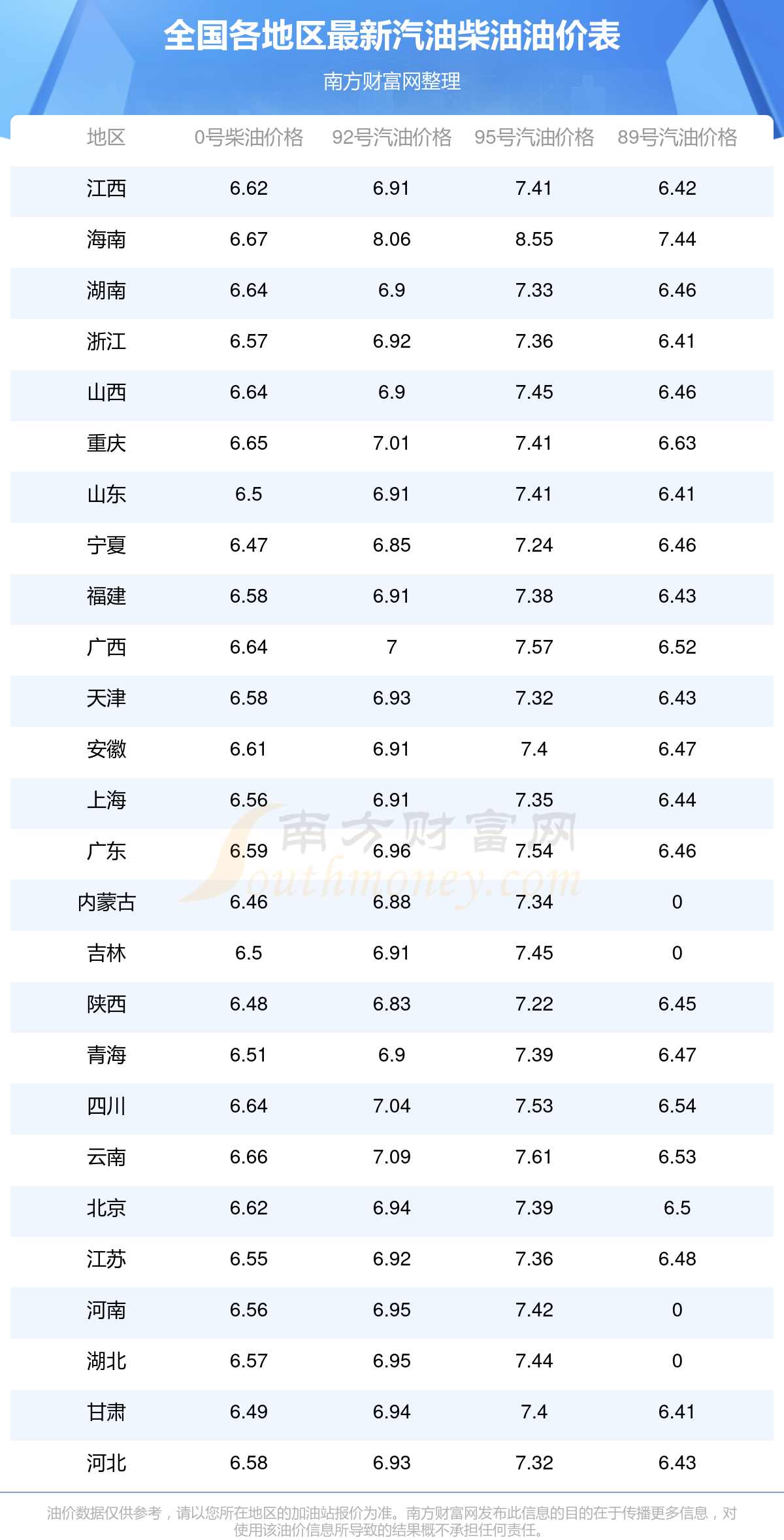 以上數(shù)據(jù)僅供參考,請以您所在地區(qū)的加油站實(shí)際售價為準(zhǔn)。南方財富網(wǎng)發(fā)布此信息的目的在于傳播更多信息,對使用該油價信息所導(dǎo)致的結(jié)果概不承擔(dān)責(zé)任。