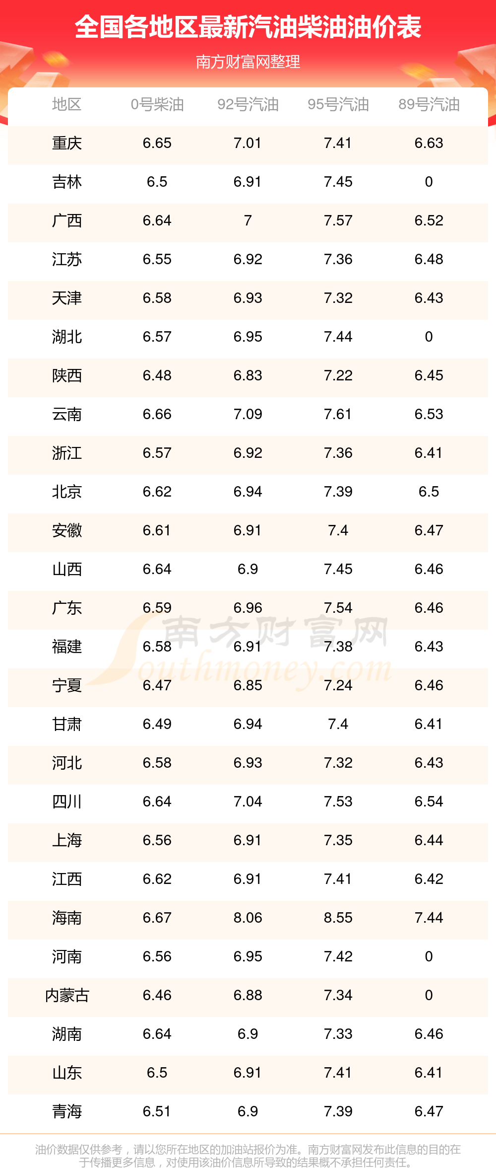油價數(shù)據(jù)僅供參考,請以您所在地區(qū)的加油站報價為準(zhǔn)。南方財富網(wǎng)發(fā)布此信息的目的在于傳播更多信息,對使用該油價信息所導(dǎo)致的結(jié)果概不承擔(dān)任何責(zé)任。