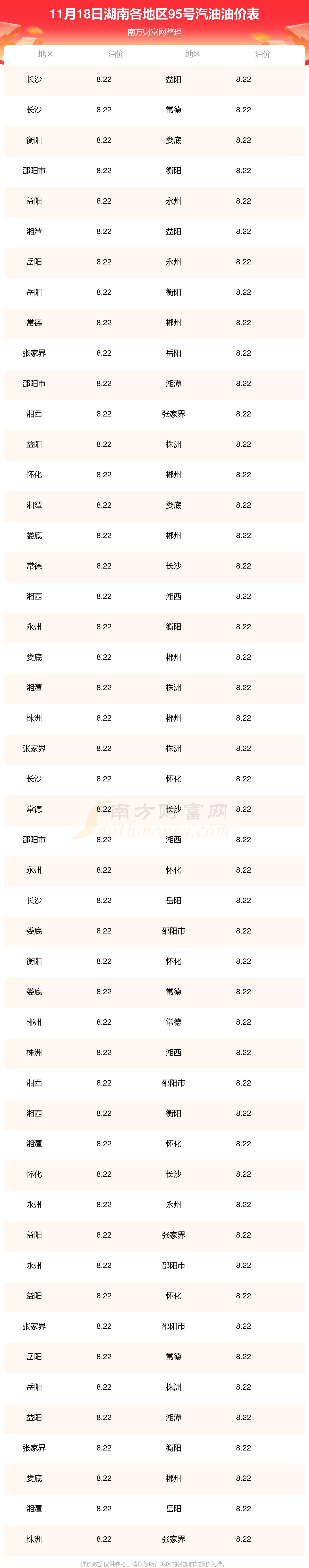 11月18日,湖南95號汽油的價格是7.33元每升,本次的調(diào)整時間為11月11日,對比上次的調(diào)整上升了0.11元,上升1.462%,11月24日24時為下一輪油價調(diào)整時間,還有6.74天。