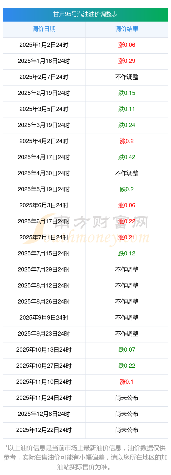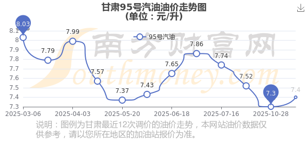11月18日,甘肅95號汽油的價格是7.4元每升,本次的調整時間為11月11日,對比上次的調整漲了0.1元,漲1.37%,下次調整時間為11月24日24時,還有6.73天。