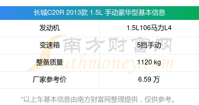 長城C20R 2013款 1.5L 手動(dòng)豪華型動(dòng)力方面,搭載的是一臺(tái)1.5L106馬力L4自然吸氣發(fā)動(dòng)機(jī),匹配5擋手動(dòng)擋變速箱,燃料形式為汽油,常規(guī)整備質(zhì)量1120kg,廠家參考價(jià)6.59萬元。