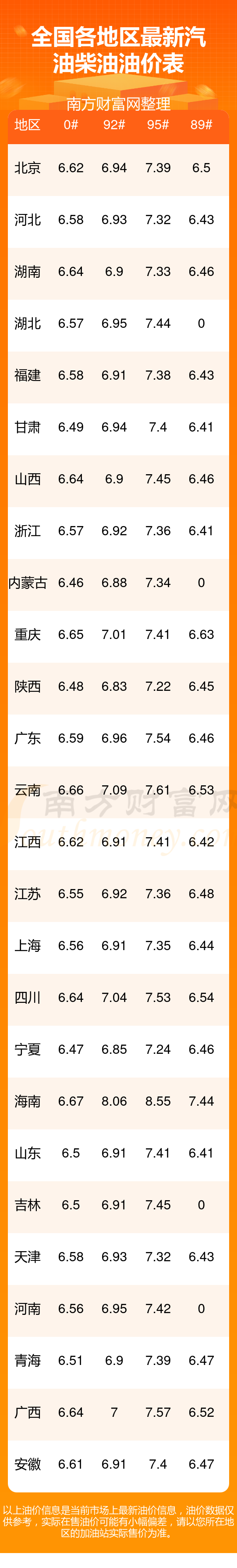 2025年11月18日全國(guó)各地汽油價(jià)格一覽表